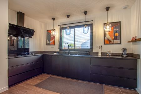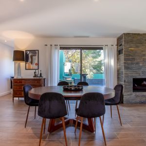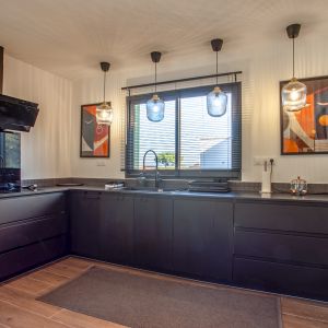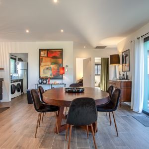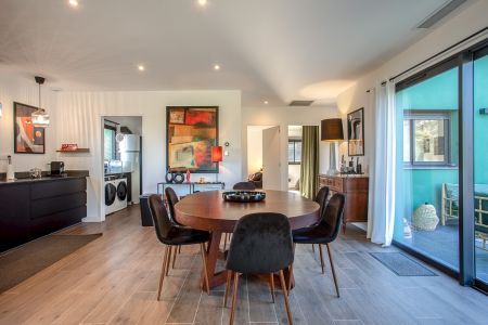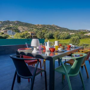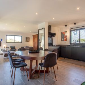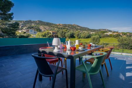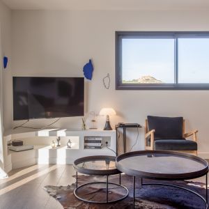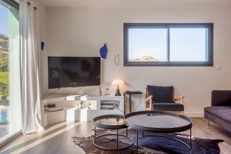 la villa est tout equipée , entierement climatisée avec 4 chambres chacune possedant sa salle de bain privée et TV , decorée avec style alliant le moderne au charme corse.La cuisine "open space" s'ouvre sur la pièce à vivre tres lumineuse avec salle à manger et salon .