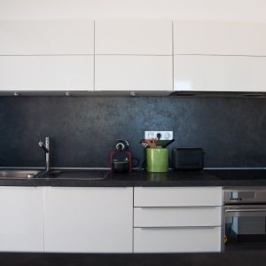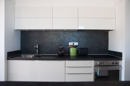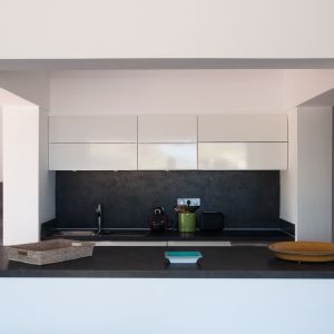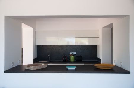 La cuisine américaine donne sur le salon et la terrasse en teck avec une vue imprenable sur la mer, elle est entièrement équipée : réfrigérateur américain, lave vaisselle, four traditionnel, four à micro ondes et, hotte, cuisinière.