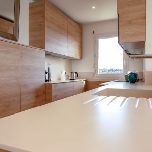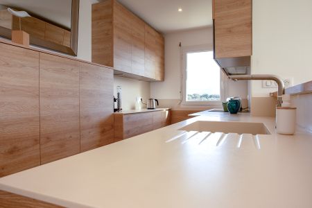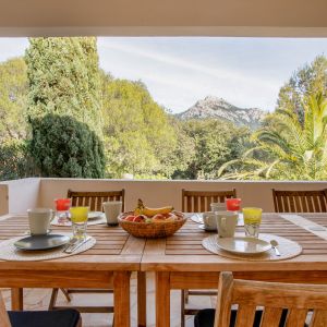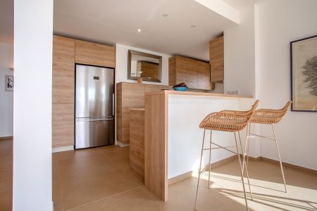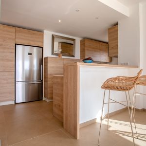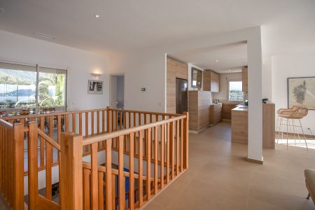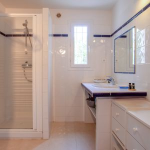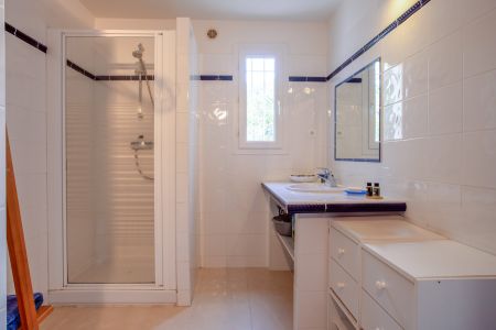 Cuisine americaine toute équipée ouverte sur un séjour spacieux (70 m2) s'ouvrant sur la terasse piscine , 3 chambres climatisées , 1 salle d'eau et une salle de bain + 2 WC.